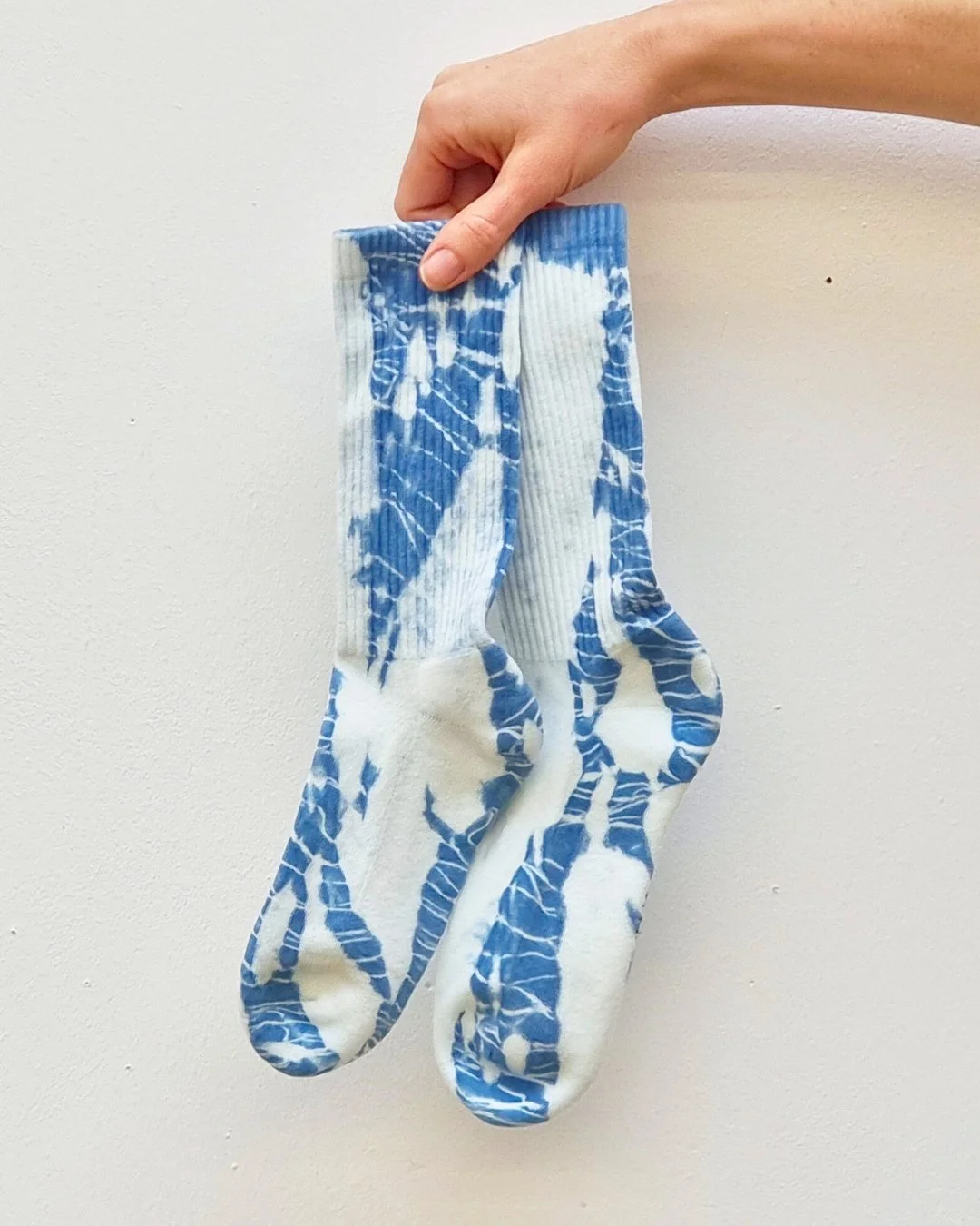 This intensive process, carried out in collaboration with artist Rebekka Gnädinger, has resulted in hand-dyed indigo socks. They were dyed with natural indigo using the traditional Japanese shibori technique—each pair is unique.